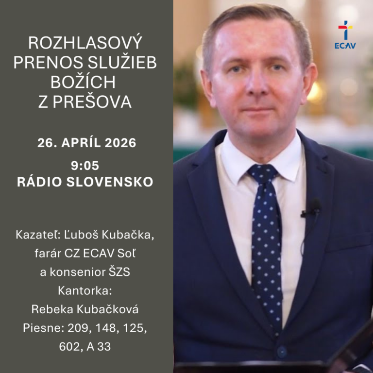 NEDEĽA, 26. apríl 2026 Rádio Slovensko Priamy prenos služieb Božích z evanjelického kostola v Prešove 09.05 – 10.00 Káže: Ľuboš Kubačka, farár CZ v Soli a konsenior ŠZS Piesne:
