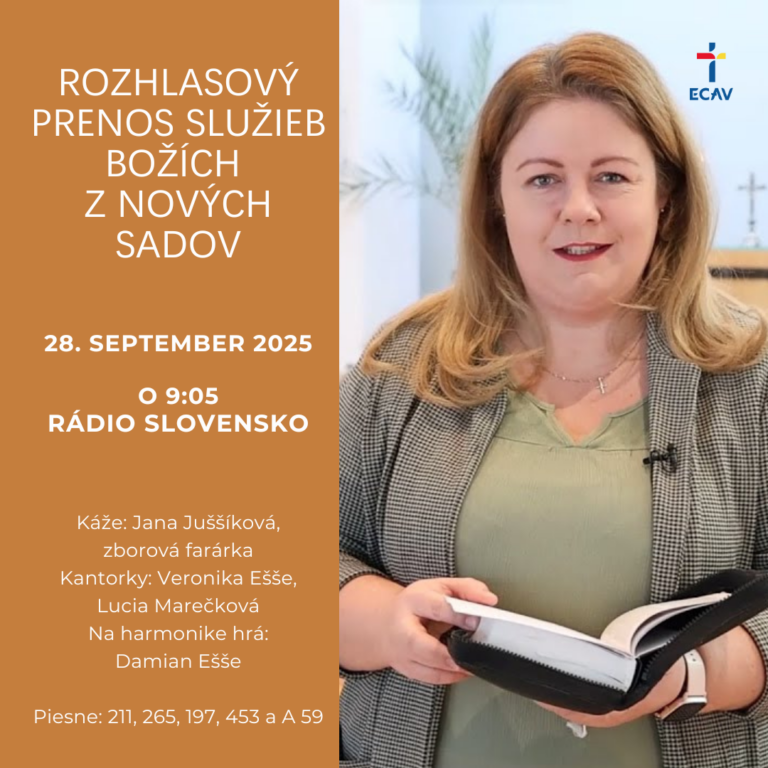 NEDEĽA – 28. september 2025 Rádio Slovensko Prenos služieb Božích 09.00 – 10.00 z evanjelického kostola v Nových Sadoch / DNS Káže: Jana Juššíková, zborová farárka Piesne: 211,