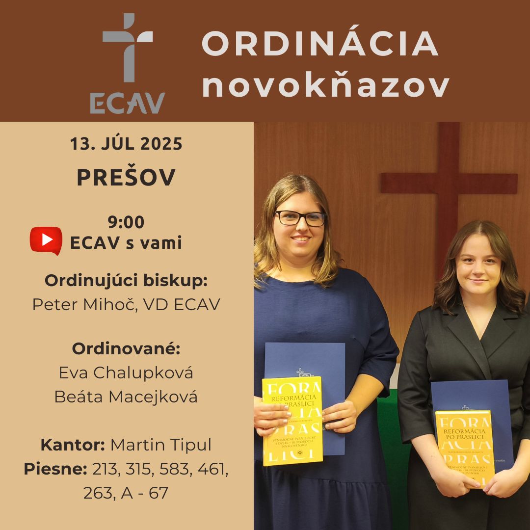 Slávnosť ordinácie novokňazov sa uskutoční 13. júla 2025 o 9.00 hod. v Evanjelickom a. v. chráme Božom v Prešove za účasti všetkých 3 biskupov. Ordinujúcim biskupom bude brat biskup VD ECAV, Peter Mihoč.