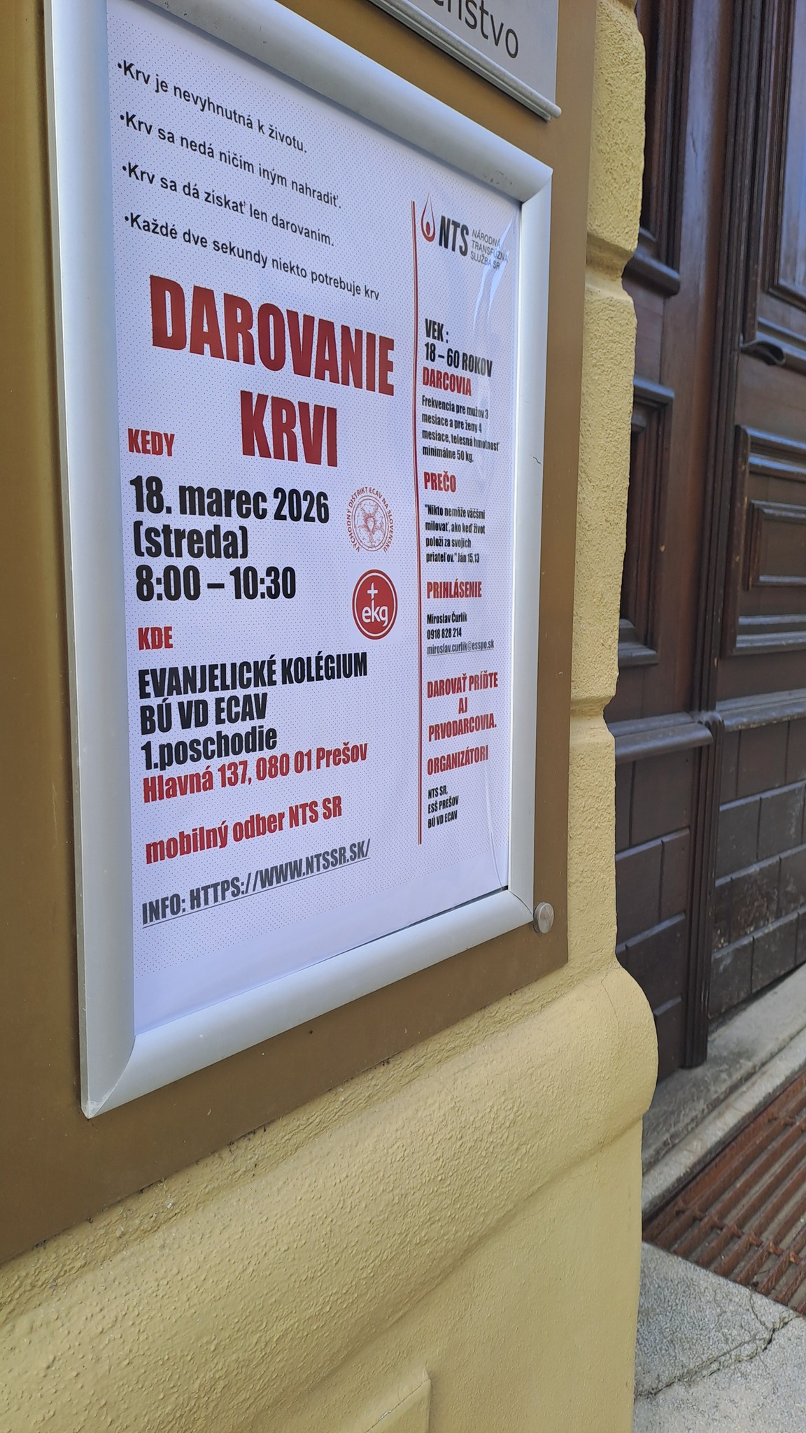 Žiaci Evanjelického kolegiálneho gymnázia sa 13. marca 2026 zapojili do darovania krvi. Zásoby krvi sú pri niektorých krvných skupinách hraničné, preto je veľmi dôležité, ak sa pre tento chvályhodný čin rozhodnú mladí ľudia. Každý zdravý dospelý človek sa môže pridať k darcom krvi. Ľudia, ktorí transfúziu krvi potrebujú, sú väčšinou vážne chorí alebo zranení, ale častokrát ide o pacientov pri závažných operáciách a ženy pri komplikovaných pôrodoch. Každý z nich je odkázaný na jedného zdravého človeka, ktorý sa rozhodne preukázať dobrú vôľu a pôjde darovať krv. Aj v Evanjelickom kolegiálnom gymnáziu v Prešove vnímame žiakov a mladých ľudí ako ochotných a pomáhajúcich iným.