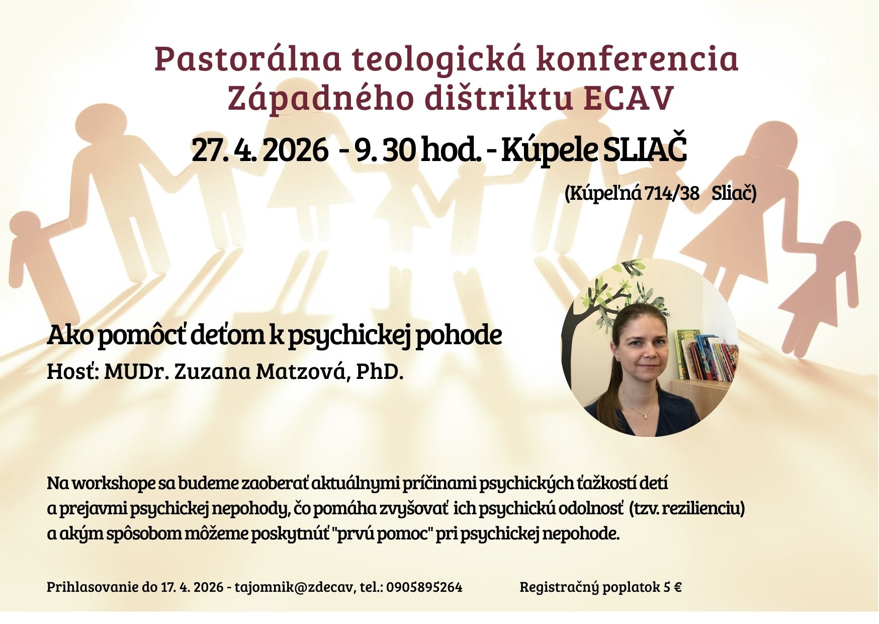 Registračný poplatok je 5 €. Prosíme, uhraďte ho pred konaním konferencie – do 17. 4. 2026 na číslo účtu: Primabanka: Názov účtu: Západný dištrikt Evanjelickej cirkvi augsburského vyznania na Slovensku SK0656000000009700051002 /VS 270426/ do informácie uveďte svoje meno a CZ.