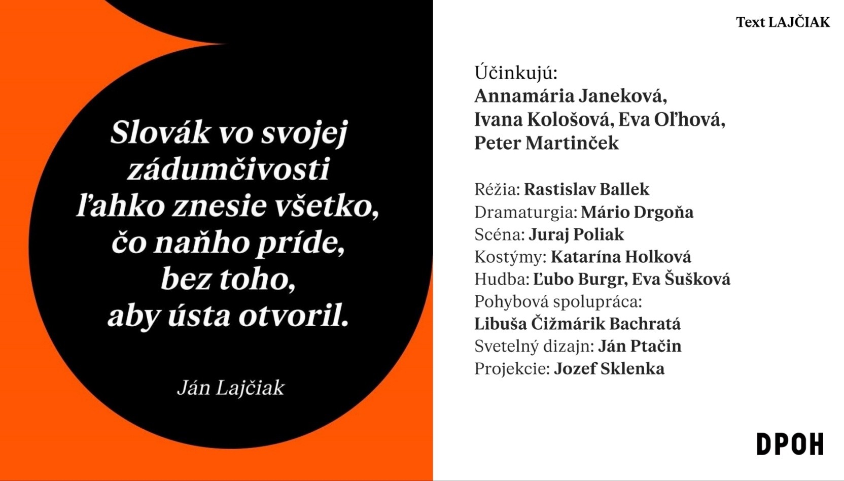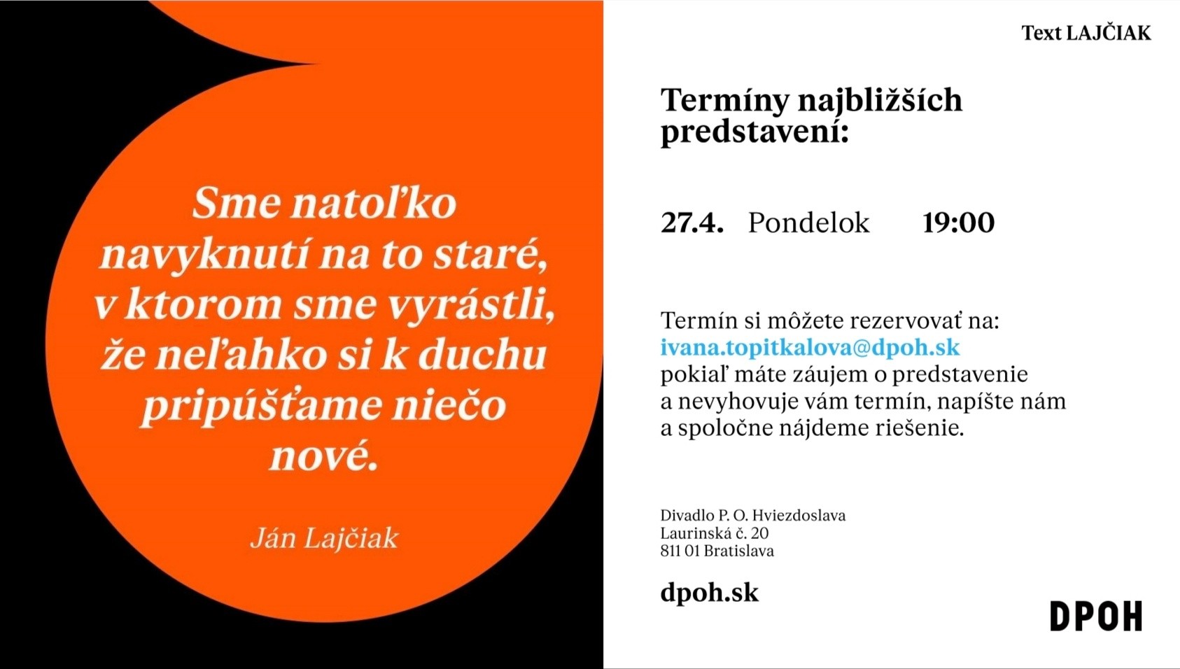 V prípade, že by ste mali záujem, môžete využiť promo kód TEXTLAJCIAK15, s použitím ktorého si môžete zakúpiť vstupenky za zvýhodnenú cenu 15 eur (na webe v sekcii promo kódy – https://dpoh.sk/…/text-lajciak/69a53bbf80368c83dcf8d897/ – aj osobne v divadelnom kiosku).