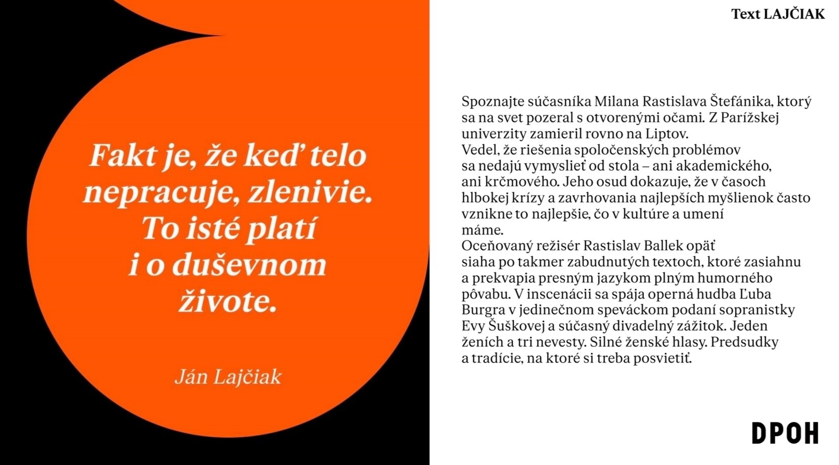 Srdečne Vás pozdravujeme z Divadla P. O. Hviezdoslava. Touto cestou by sme Vás radi pozvali na predstavenie inscenácie text Lajčiak o slovenskom mysliteľovi, evanjelickom farárovi, autorovi spisu Slovensko a kultúra, súčasníkovi Milana Rastislava Štefánika – Jánovi Lajčiakovi, ktoré sa odohrá dňa 27.4.2026 (pondelok) o 19:00. Pred predstavením sa uskutoční dramaturgický úvod o 18:30.